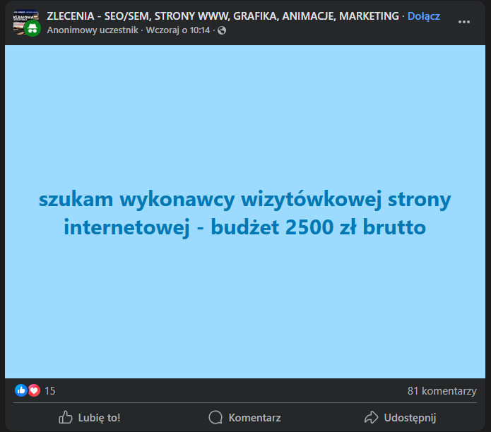 Każdy, kto choć raz wrzucił post w stylu „Szukam informatyka / osoby do strony / kogoś od Google Ads” wie, co się dzieje dalej. W kilka minut pod postem pojawia się kilkadziesiąt komentarzy. Często są to osoby, które oferują wszystko: od stron, przez reklamy, po „pełną obsługę IT”, zwykle za jak najniższą cenę.