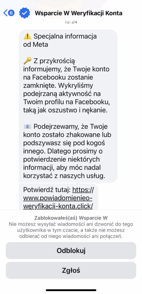 Atak polega na przejęciu prawdziwych profili użytkowników, zmianie ich nazwy na „Wsparcie W Weryfikacji Konta” oraz masowym wysyłaniu do znajomych fałszywych komunikatów o rzekomej blokadzie konta. W wiadomości pojawia się informacja o wykryciu podejrzanej aktywności, o podejrzeniu podszywania się pod kogoś innego i o konieczności potwierdzenia tożsamości. Dołączony link kieruje do strony wyglądającej identycznie jak Facebook, ale nie jest to oficjalny adres Meta – to strona phishingowa przygotowana wyłącznie po to, by wyłudzić Twoje dane logowania. Dokładnie tak wygląda oszustwo pokazane na screenie, gdzie widzimy wiadomość z linkiem do domeny „https://www.powiadomienieo-weryfikacji-konta.click/”.